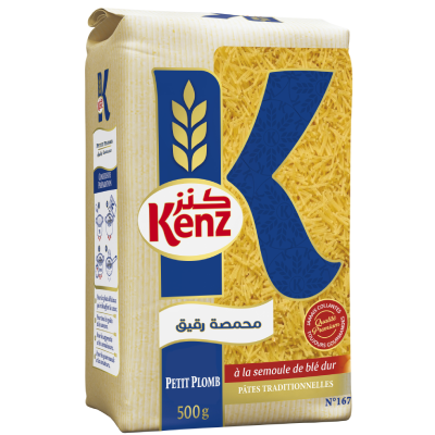 Les pâtes Petit Plomb Kenz (également connues sous le nom de Mhamssa) sont une variété de petites pâtes rondes traditionnelles du Maghreb, fabriquées à partir de 100 % de semoule de blé dur de qualité supérieure. Elles sont réputées pour leur texture ferme qui ne colle pas après la cuisson, ce qui les rend idéales pour les soupes, les salades ou les plats mijotés comme le Berkoukes.